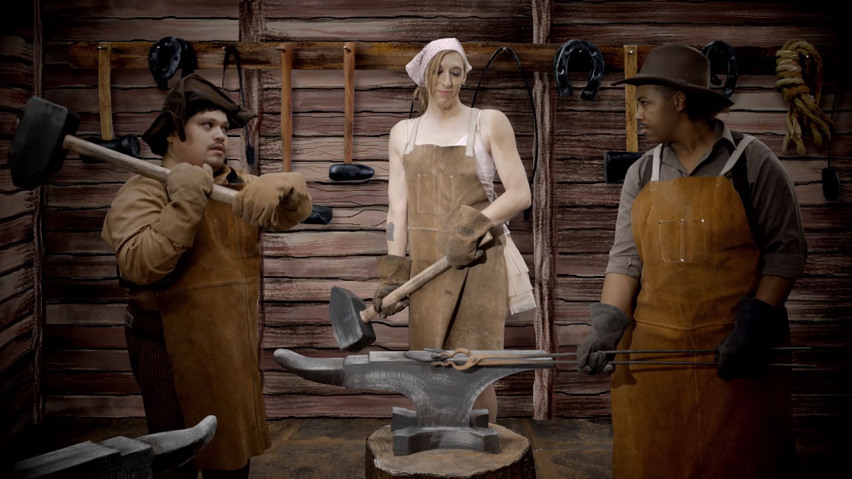 Set in a campy western mining town, Stinkhorn tells the tale of a lady blacksmith named Dusty and her naughty trickster paramour, Blaze. At night Blaze turns Dusty’s apprentices into horses and rides them all night long, Finally, Cassidy, the clever apprentice hatches a plan. A psychedelic trip wrapped in a queer western, Stinkhorn is a magical who-rides-who tale with a twist. Combining live action, drawings, miniatures and animation, Stinkhorn is the second story in, Fairy Fantastic!, a gender diverse folk and fairy tale series.